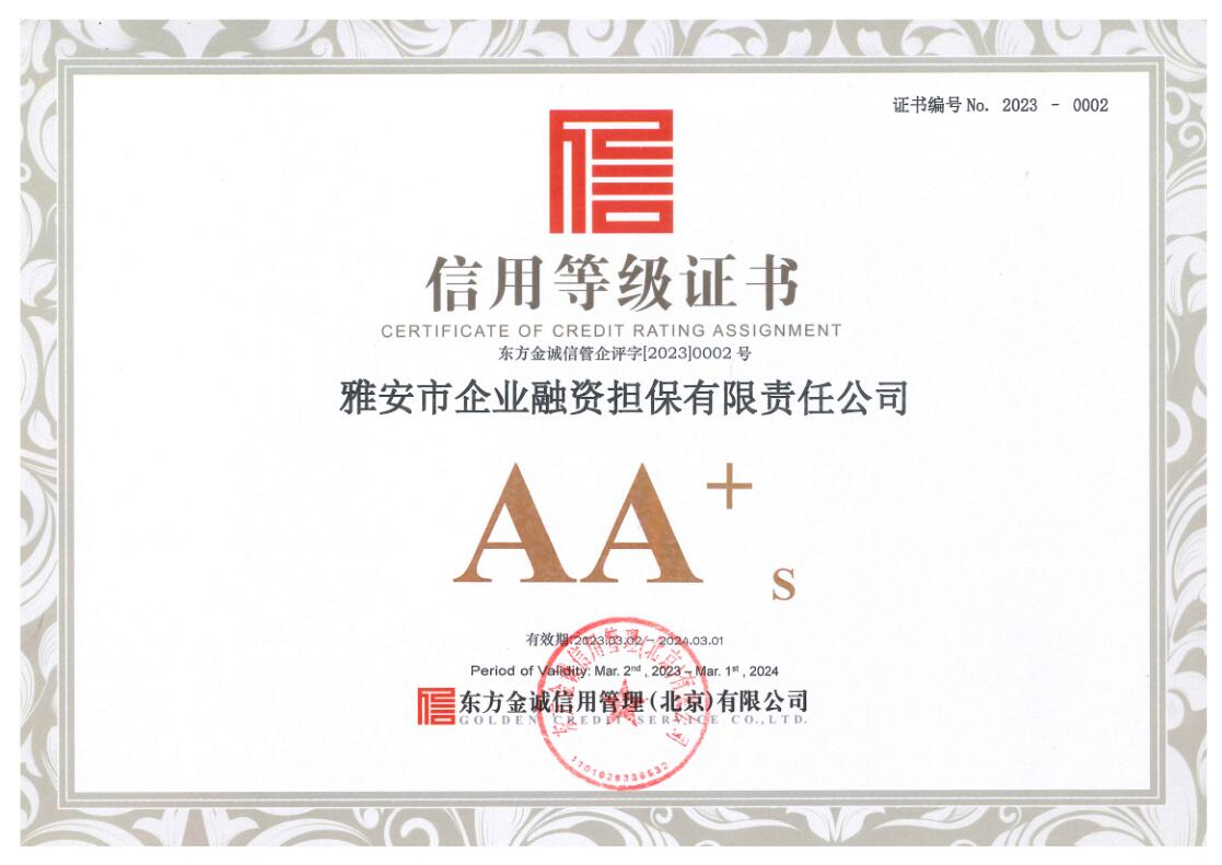 3月3日,雅安市企業(yè)融資擔(dān)保有限責(zé)任公司(以下簡(jiǎn)稱“市擔(dān)保公司”)傳來喜訊,經(jīng)東方金誠(chéng)信用管理(北京)有限公司通過對(duì)市擔(dān)保公司的信用狀況進(jìn)行綜合分析和評(píng)估,確定該公司信用等級(jí)為AA+。